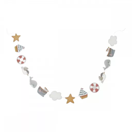 A Little Dutch új dekorációs terméke ez a füzér, melyen a tengerész kollekció mintáival díszített kartonok sorakoznak. Kövesd végig a motívumokat és képzelj el egy tengerparti kalandot, vagy hajózz képzeletben egy szigetre és fedezd fel a tengerben a bálnákat vagy a fejed fölött elrepülő sirályokat.