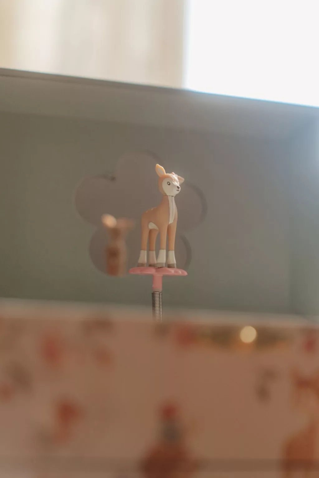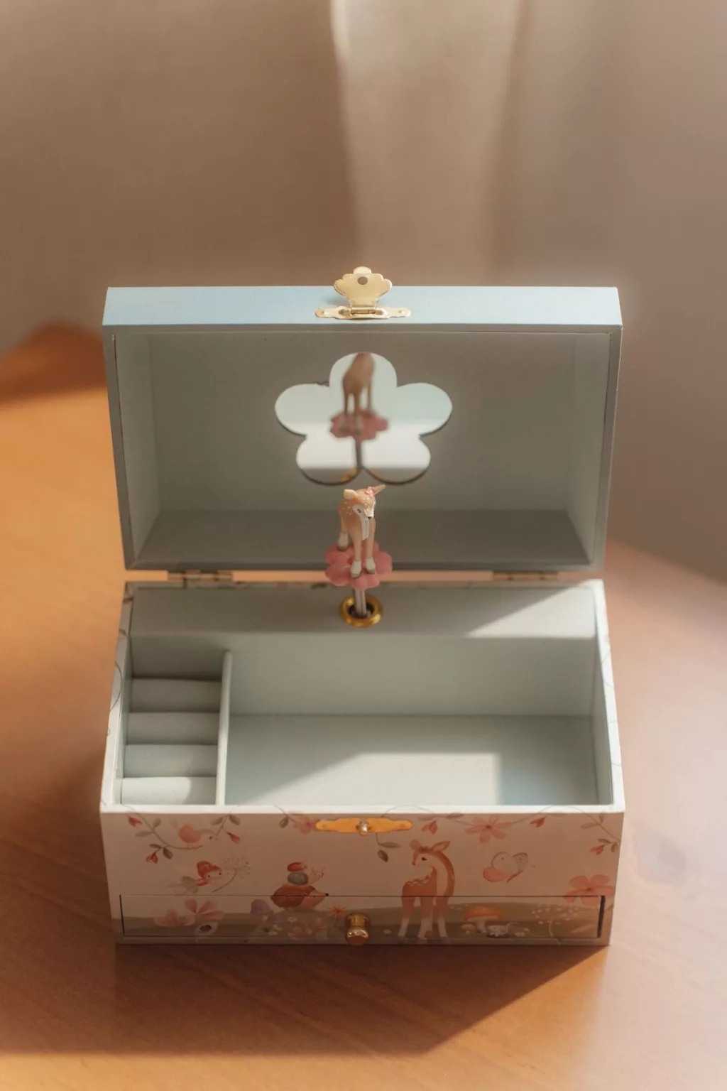 A doboz hátoldalán lévő kulcs felhúzásával, a doboz felnyitása után a kellemes zene és az őzike tánca minden kislányt elvarázsol majd.
