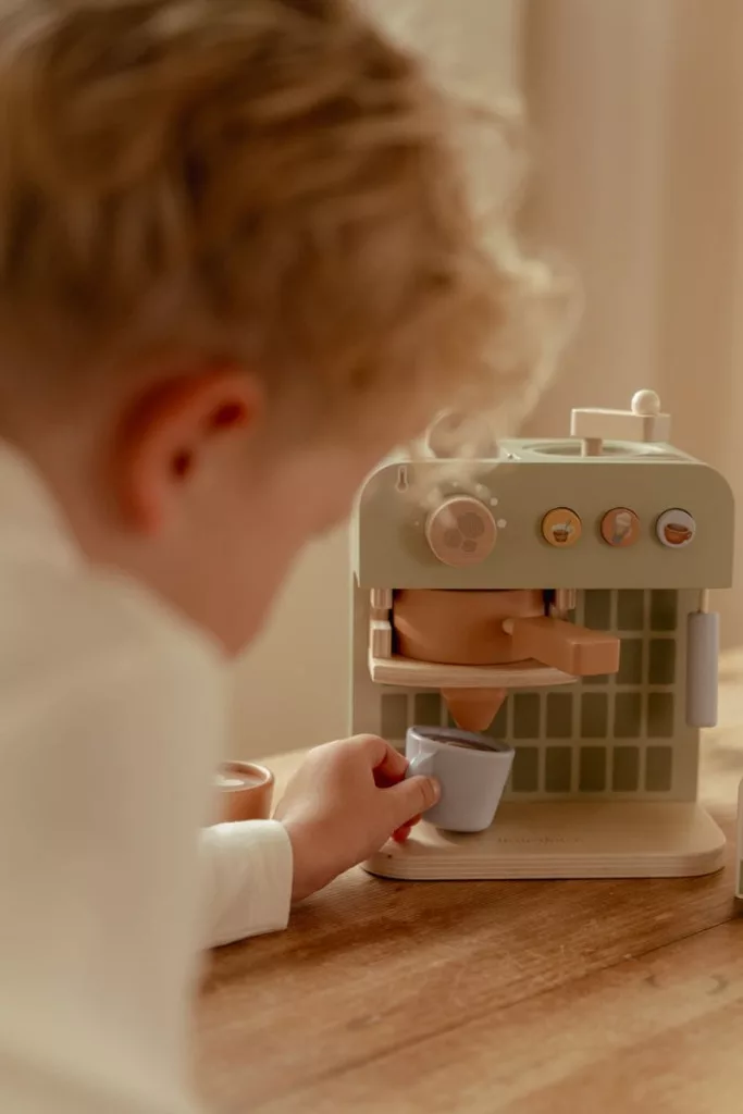 Ezzel a bájos, fából készült kávéfőzővel a kis baristák örömmel őrölhetik a kávébabot, helyezhetik be a kapszulát, majd kanállal meg is keverhetik kedvenc italukat.
