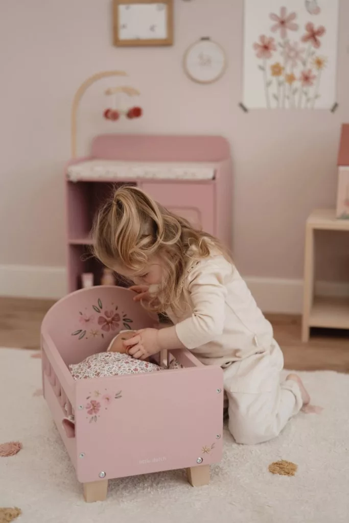 Ebben a bájos, fából készült babaágyban gyermeked kedvenc babája igazán kényelmesen és puhán pihenhet.