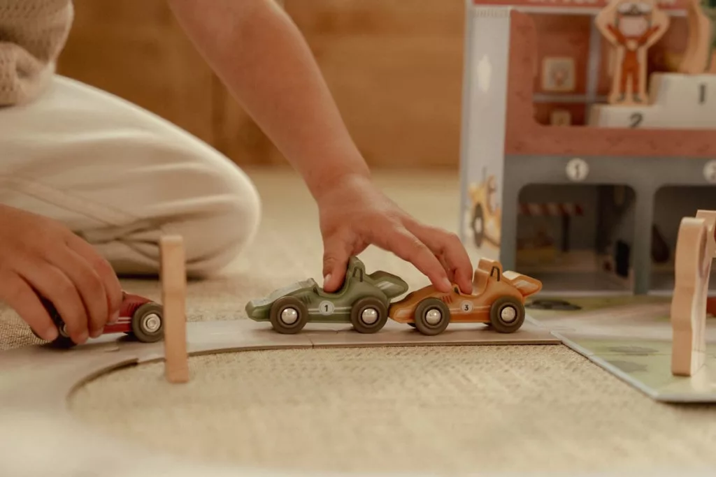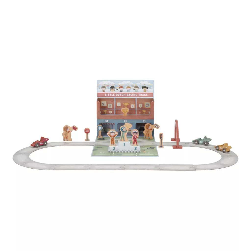 A szett mindent tartalmaz, amire egy igazi futamhoz szükség lehet: versenyautók, sofőrök, célvonal, közlekedési táblák, trófea és dobogó is helyet kapott benne.