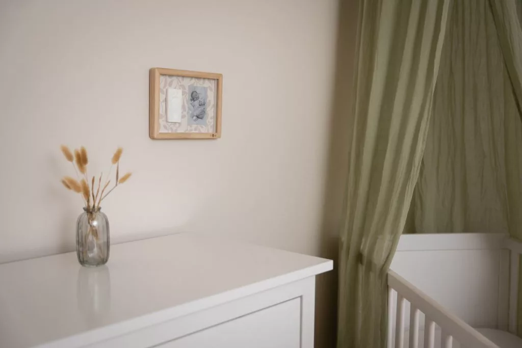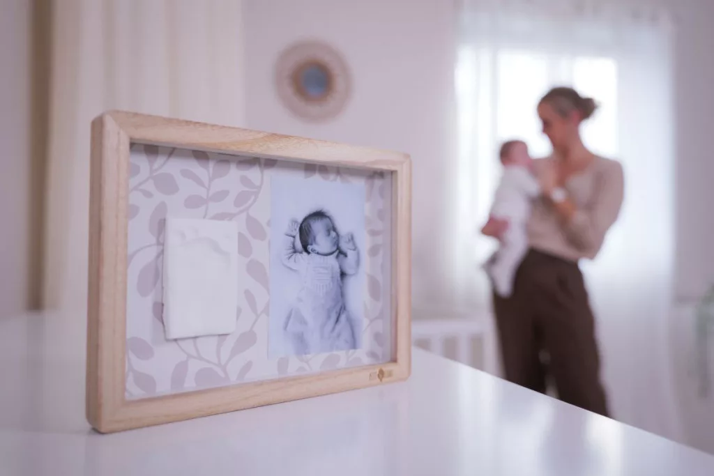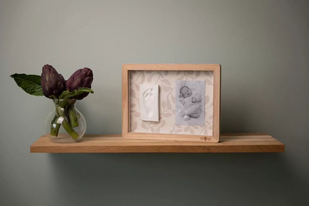 Ez a falra akasztható klasszikus képkeret úgy készült, hogy egy fényképet és a baba lenyomatát is megjelenítshesse.